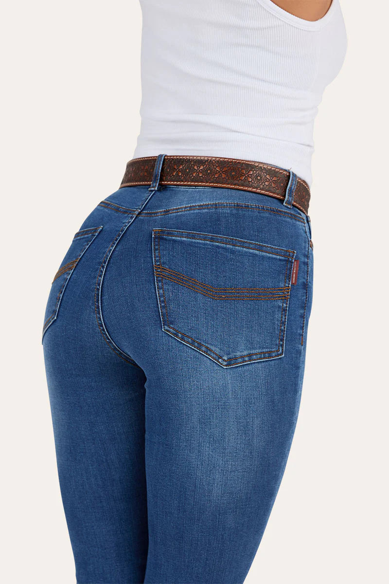 The Penny Women's High-Rise Bootleg Jeans are the perfect blend of Western style and everyday functionality. High-rise and designed to sit above the belly button, these jeans follow your natural curves through the hips and thighs, flaring out below the knee for a classic bootleg cut. The cotton-blend fabric, with a hint of elastane, gives you breathability and a slight stretch for ease of movement. Featuring a traditional five-pocket style and branded with the Ringers Western bull embroidery on the coin pocket, the Penny jeans combine a flattering fit with practical details. Perfect for days on the ranch or nights on the town, these jeans offer all-day comfort and style.
